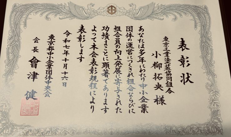 弊社は、東京工業塗装協同組合に加入しており、私は理事、副理事長を仰せつかっております。この度、協同組合を日頃、ご指導頂いている東京都中小企業団体中央...