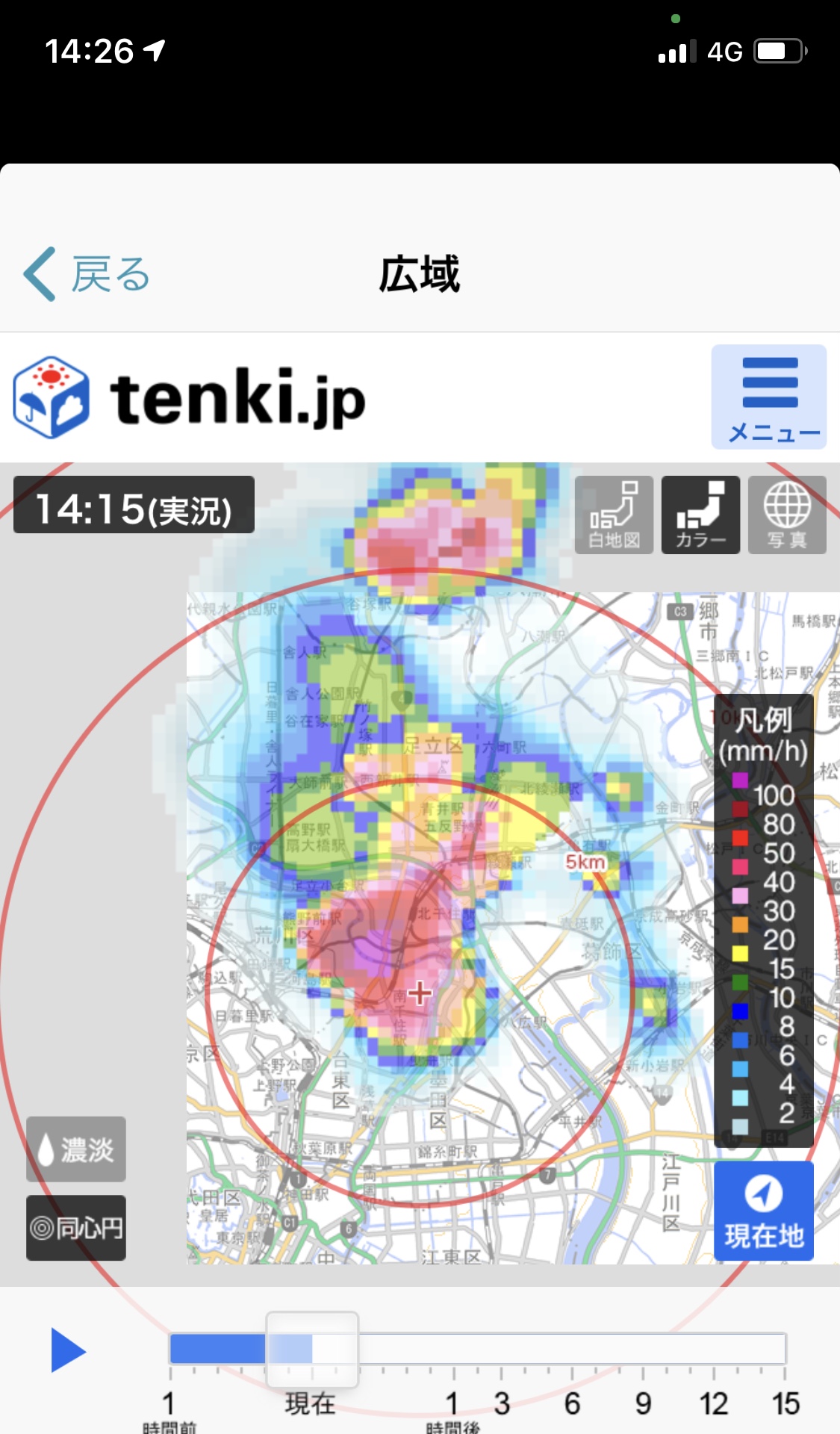 ゲリラ豪雨は、ほんと狭い範囲で大雨が降ってます。Xバンドレーダーで見るとこんな感じです。土砂降りの時は、よほどの急ぎでなければ無理して雨に濡れることはないですね。安全第一です。