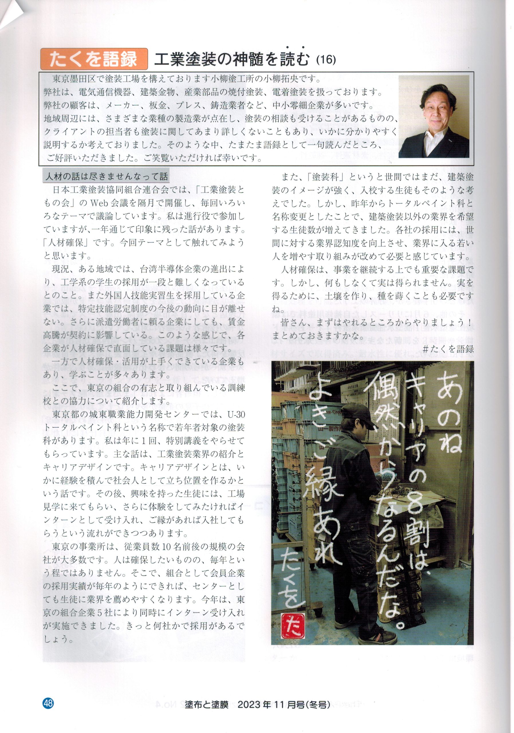 工業塗装の業界季刊誌「塗布と塗膜」2023年11月(冬)に連載コラムが掲載されました。