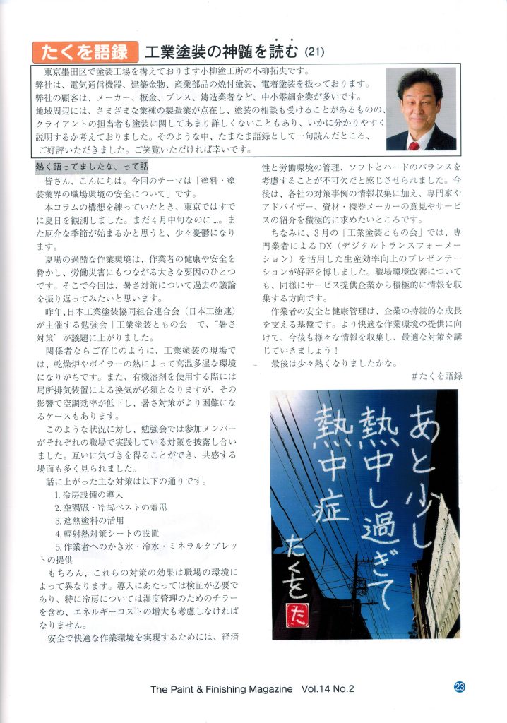 日々のこと コラム掲載(塗布と塗膜 R7、5月号) 2025.05.27 塗料報知新聞社の季刊誌、「塗布と塗膜」に掲載されました。前回は、特集に寄稿しておりましたので、1回休みでの再開です。この時期の暑さ対策の話は、準備する上でもタイムリーと考え、触れてみました。弊社でも、昨年、塗料倉庫に保管していた塗料で、今まで劣化したことのなかった種類のもの夏の暑さで、ダメになった経験をしました。今年は、対策しております。皆様のところはいかがでしょう? Tweet Share Hatena Pocket RSS feedly 日々のこと, たくを語録 塗料報知新聞社 季刊誌「塗布と塗膜」特集に寄稿しまし... 生成AIの話