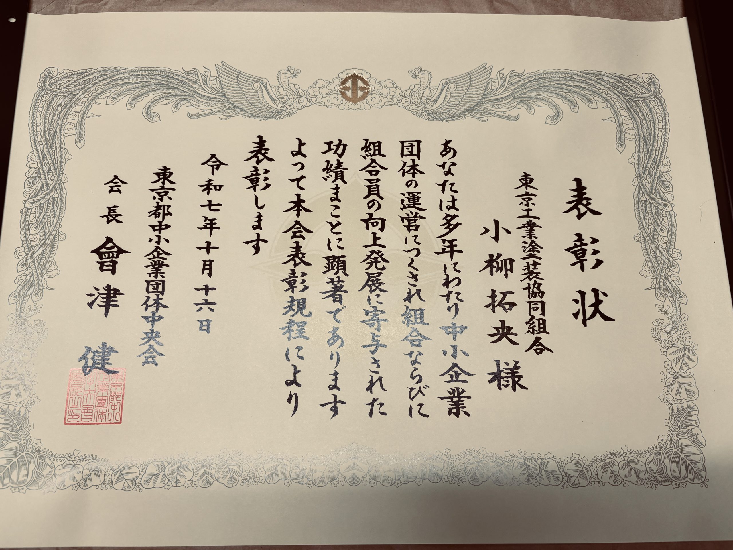 弊社は、東京工業塗装協同組合に加入しており、私は理事、副理事長を仰せつかっております。この度、協同組合を日頃、ご指導頂いている東京都中小企業団体中央会様より会長表彰を頂きました。