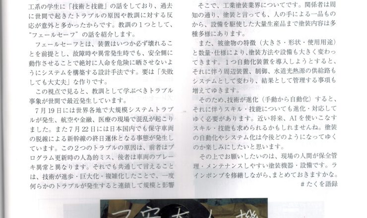 塗料報知新聞社発刊の季刊誌 「塗布と塗膜」令和6年夏号に連載コラムが掲載されました。今回の特集は、塗工の自動化・ロボット化で、コラムのお題もそれに準...