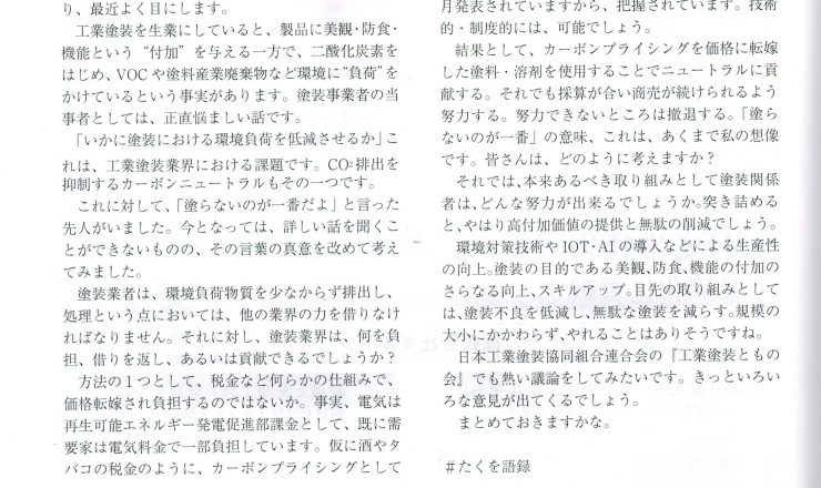 業界季刊誌「塗布と塗膜」 令和4年2月号(塗料報知新聞社)にコラムが掲載されました。 今回の本誌の特集が環境負荷低減と”カーボンニュートラル”に挑戦...