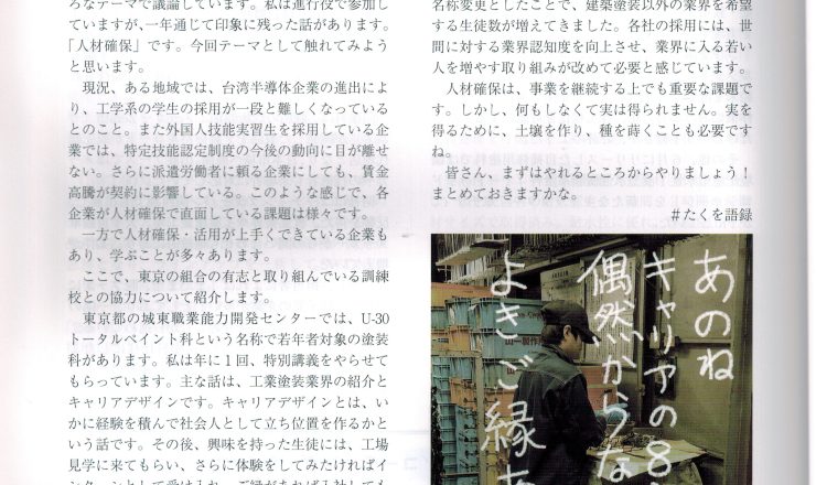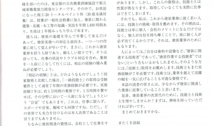塗料報知新聞社 季刊誌「塗布と塗膜」2022年5月号に連載コラムが掲載されました。技能士のお話です。 「技能士」という資格は、厚生労働省の管轄で約1...