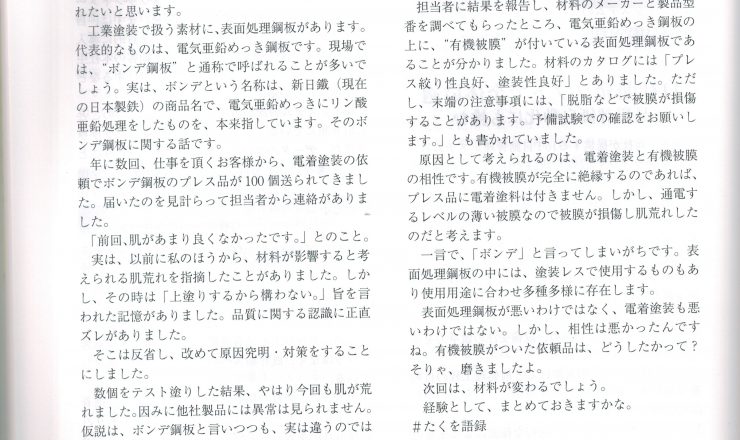 いつもお世話になっている塗料報知新聞社さんの業界誌(塗布と塗膜)でコラム掲載されました。今回は、表面処理がテーマでしたのでそれに合わせて、現場実務の...