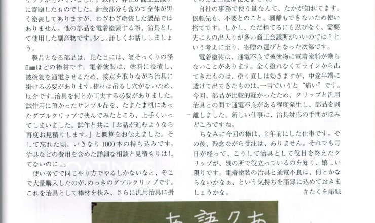 塗料報知新聞社 季刊誌 塗布と塗膜 令和5年春号電着塗装でまとめてみました。クリップを治具で使って、寄贈して、さらにコラムで使って…。三...